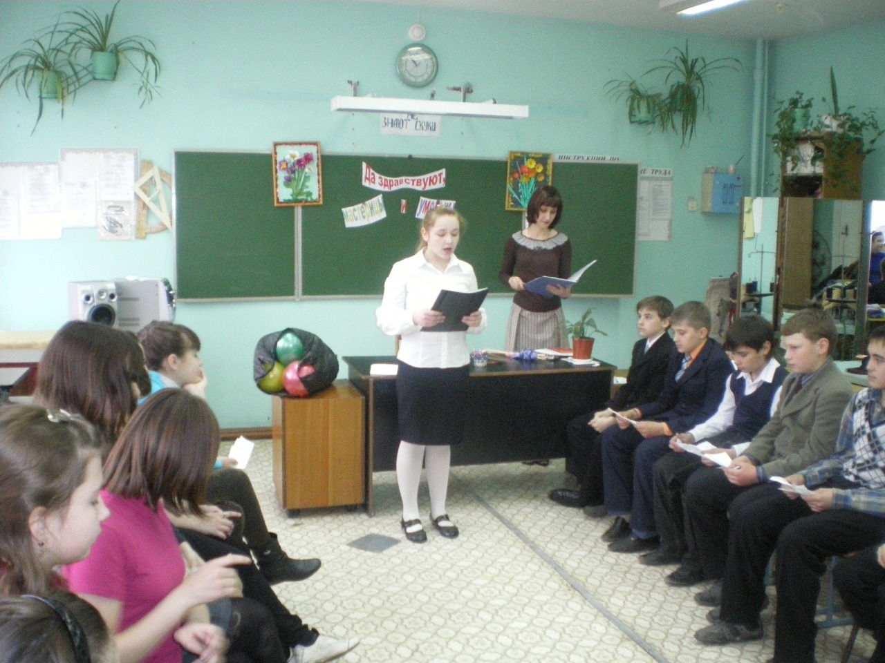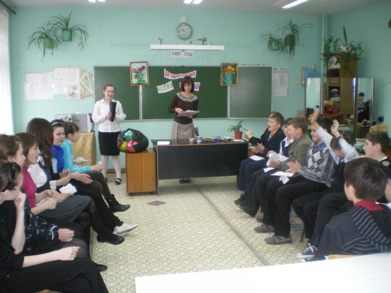 Оформление класса: красочно написанное название мероприятия, класс украшен искусственными цветами и воздушными шарами.